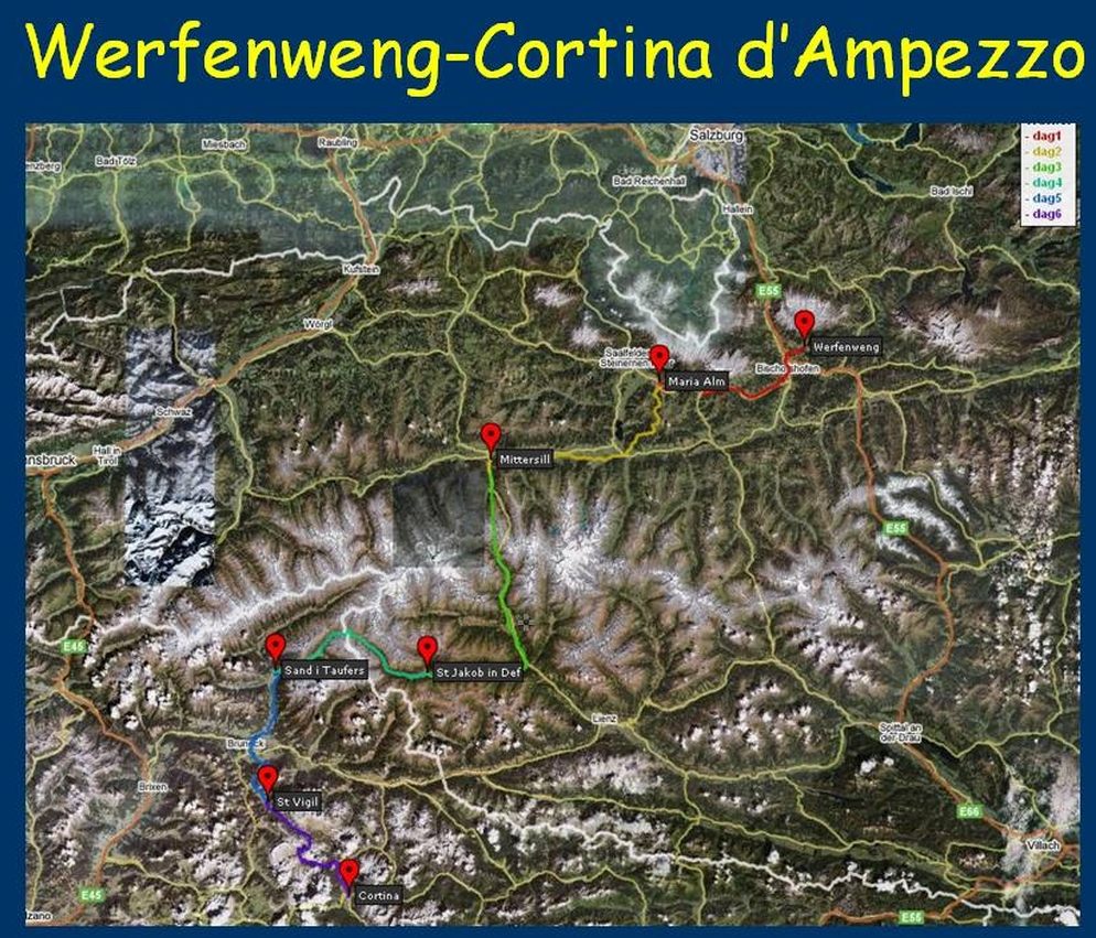 In totaal vertrokken we met 24 fietser en 3 gidsen op weg naar Cortina d`Ampezzo.  Iedere dag kon je kiezen uit 3 nivo’s.